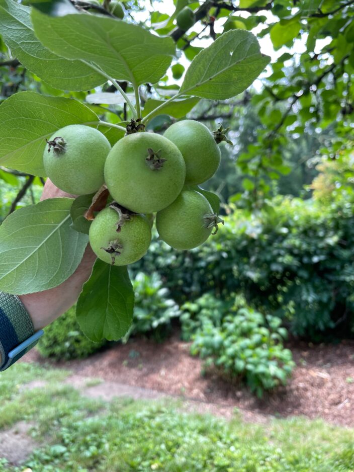 Apples and pears are the first fruits to thin in the spring if the tree is carrying a heavy fruit set – multiple fruits in a cluster, and clusters of fruits less than 6 inches apart (about the distance between your thumb and pinkie when you fold down your three middle fingers). These trees’ fruits should be thinned when the largest fruitlets are about ½ to ¾ of an inch in diameter.
