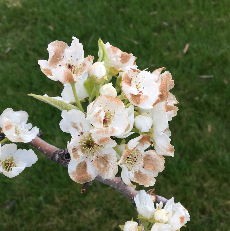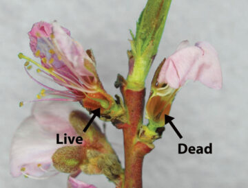 About one week after a frost event, fruit tree blossoms can be checked to see if the ovaries in the flowers were killed. There is nothing you can do about the dead ovaries, but you’ll at least understand why your harvest is smaller than usual.