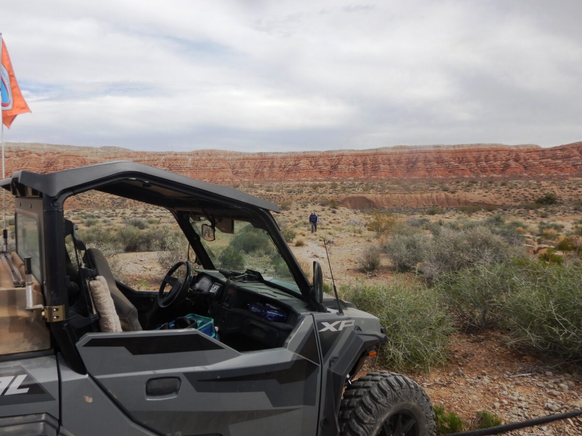 Coming to a ledge, we had to drop off. My wife didn’t feel safe, so she got out and walked down the hill. I dropped off the ledge without incident and watched the other machines negotiate the shelf without difficulty. This trail continued as we followed a beautiful red rock ridge down into Cottonwood Wash.