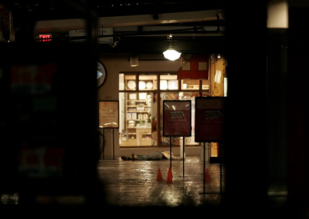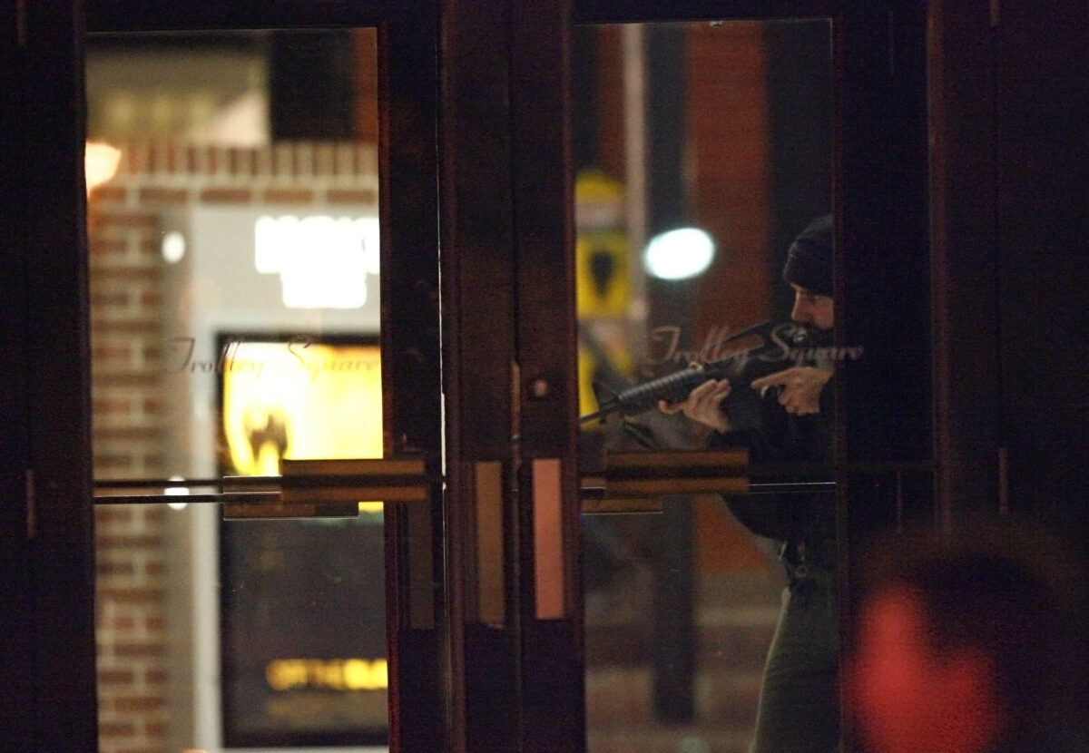 An antique-store owner, Barrett Dodds, 29, said he saw a man in a trench coat exchanging gunfire with a police officer outside a card store. The gunman was backed into a children’s clothing store.
