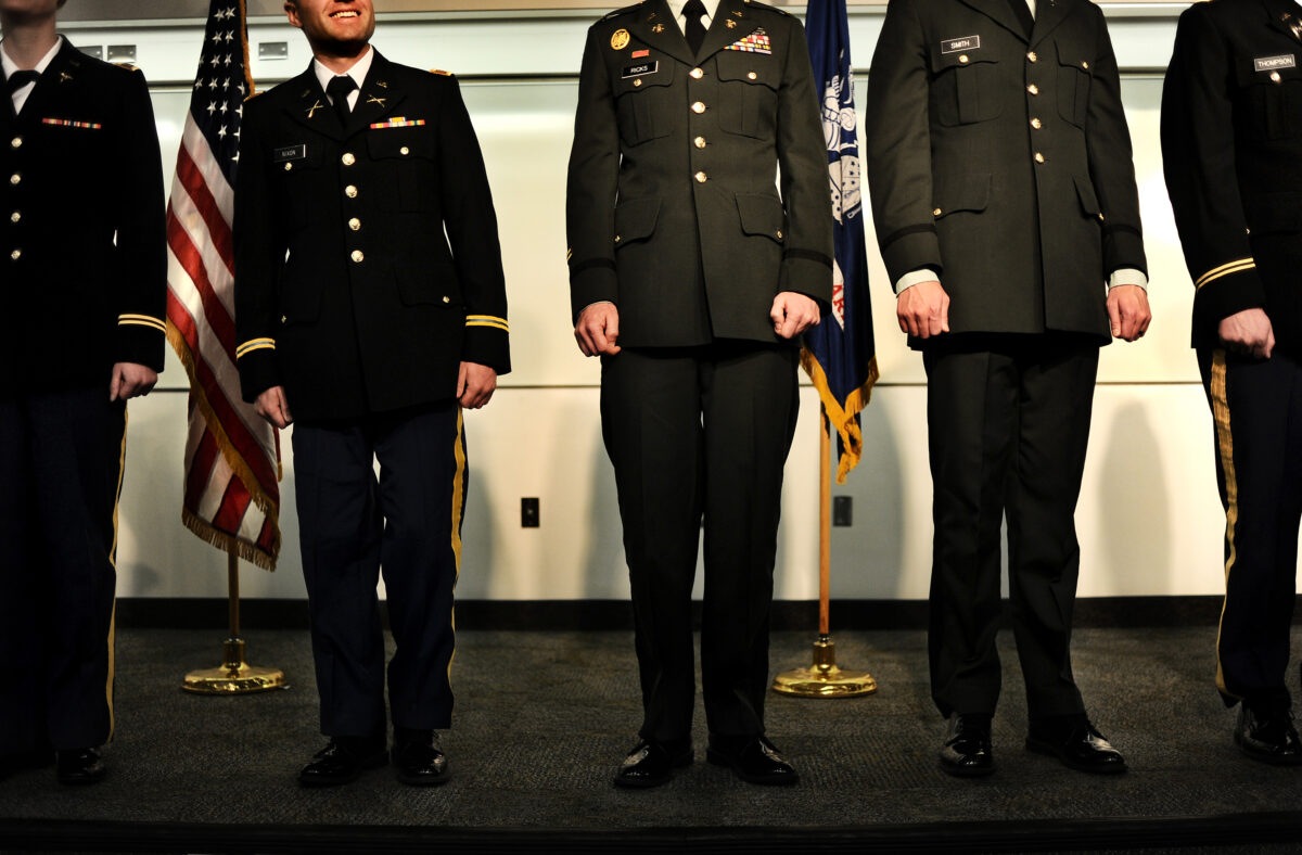 Both the Army and Air ROTC divisions held commissioning ceremonies; the Air Force commissioned 14 second lieutenants at the Varsity Theatre. At the Army’s ceremony, each cadet sat on the end of the row, family and friends filling in the rest of the rows. Alford spoke, then each cadet came up on stage, stood between the U.S. flag and the U.S. Army flag, raised his, or in one case her, right hand and swore to support and defend the Constitution.