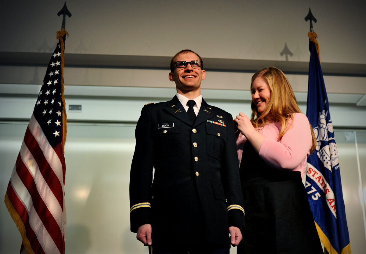 Lt. Col. Ted Leblow, the commanding officer at BYU’s division, swore in most of the officers; Capt. Philip Williams swore in two. Retired Lt. Col. Quinn Nixon swore in his son, 2nd Lt. Daniel A. Nixon. Wives, mothers, fathers, a brother and a sister participated in pinning the officers.