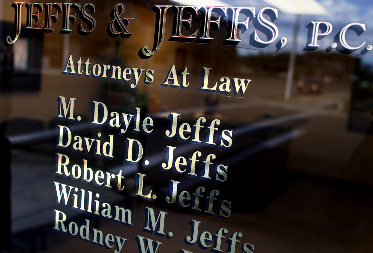 Robert said he decided to become a lawyer at an early age, as he scurried through the corridors of his father’s practice. Founded in 1957 by Robert’s father, Dayle, and uncle Dean, Jeffs & Jeffs today employes Robert’s two brothers, David and William, his cousin Randall, and his nephew Kevin.