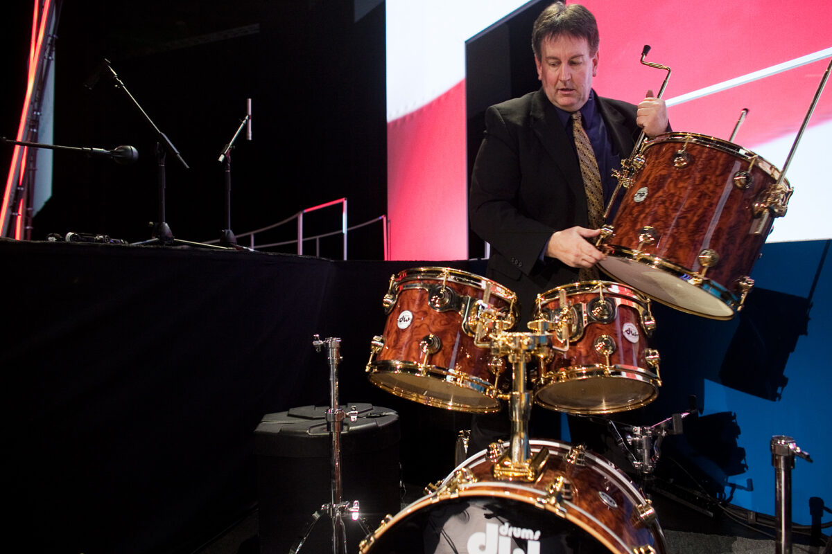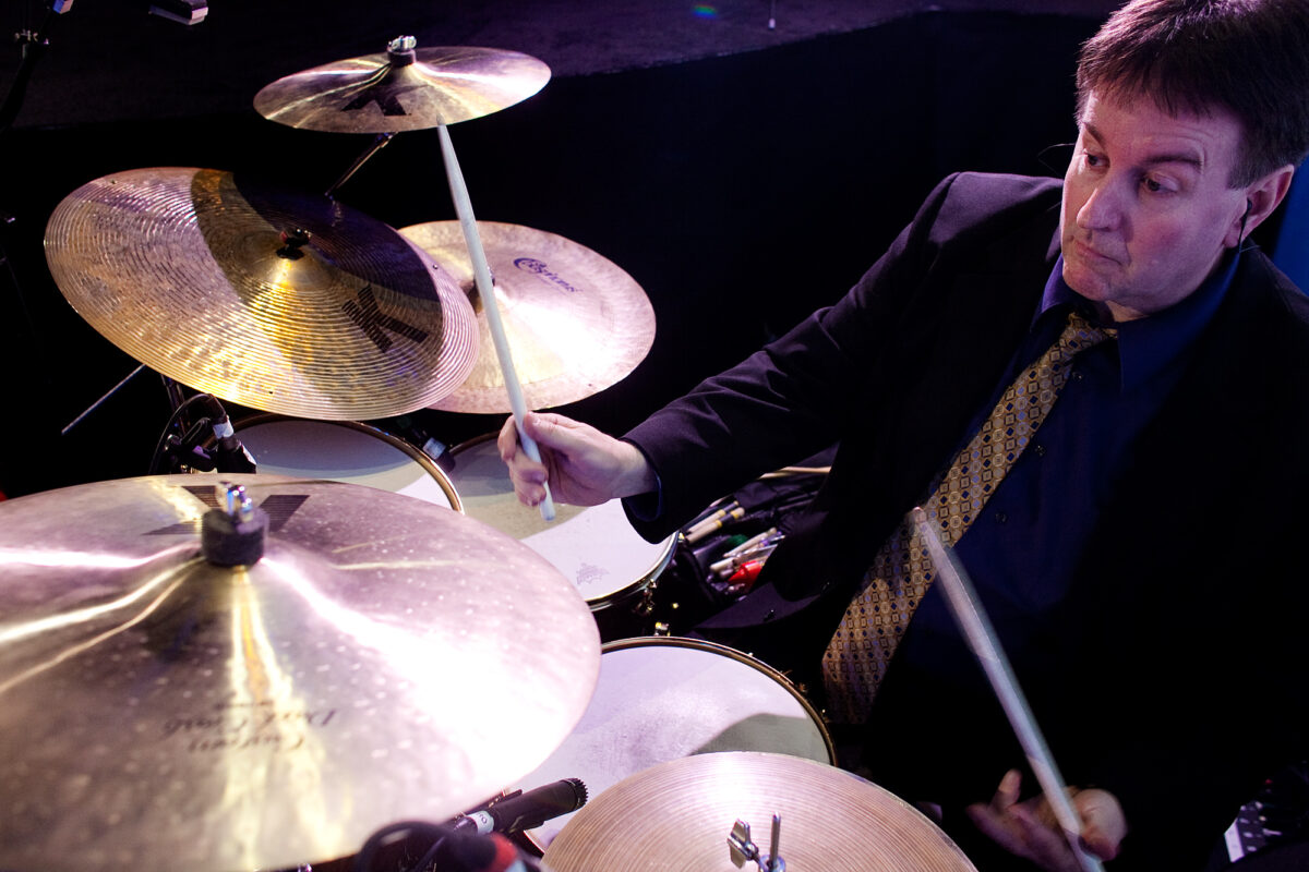His lifetime of hard work is evident both in his three-car garage full of equipment and in the way he plays. During a mic check before a band rehearsal people stop to stare or dance, including his own bandmates, as he lays down a beat with his foot pedal while his sticks work their way around the drum set.