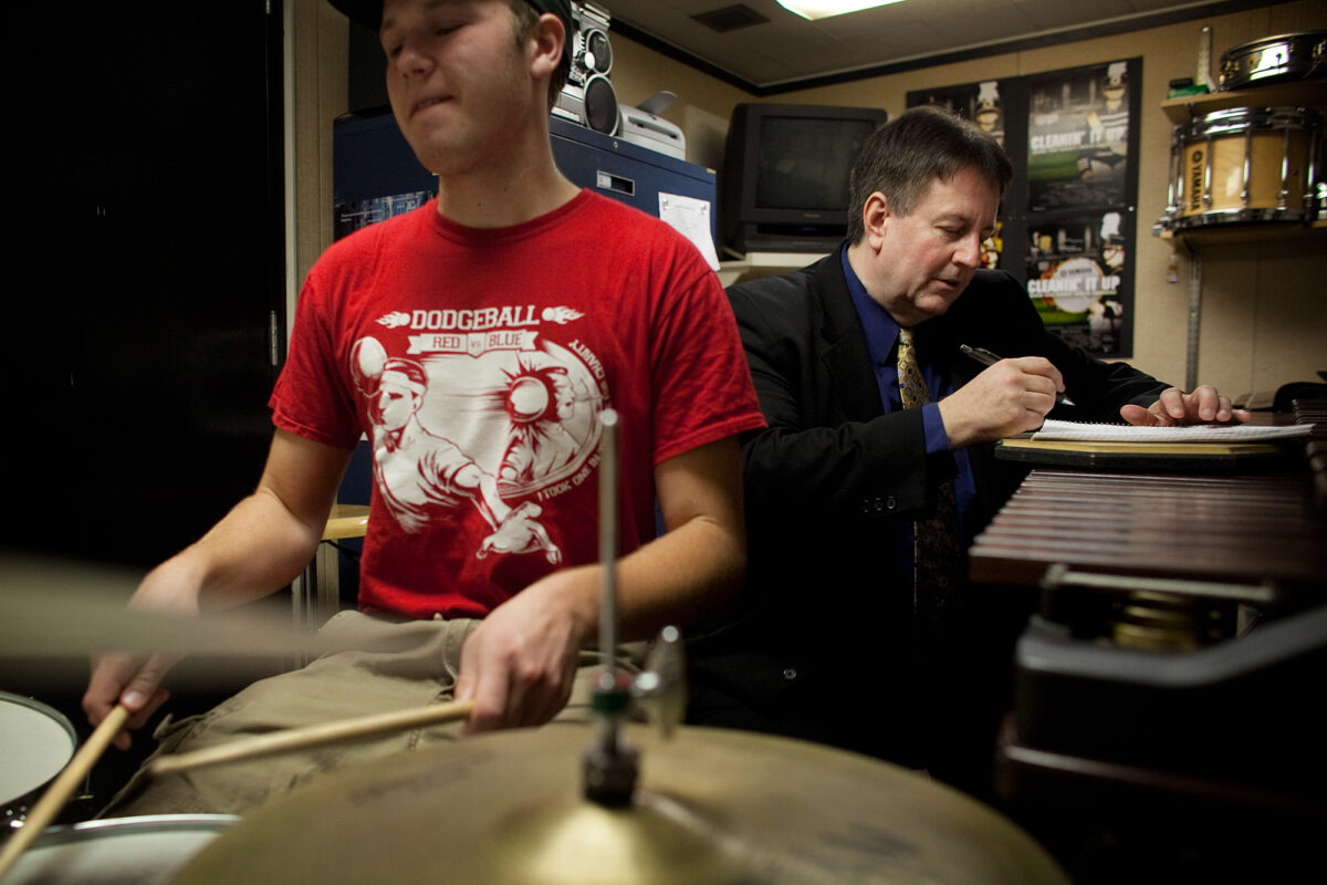 As a student plays through a number of Latin beats on the small drum set in one corner, Lawrence sits behind him scribbling notes in a practice binder. Just as the student gets the hang of one beat, Lawrence challenges him with another.