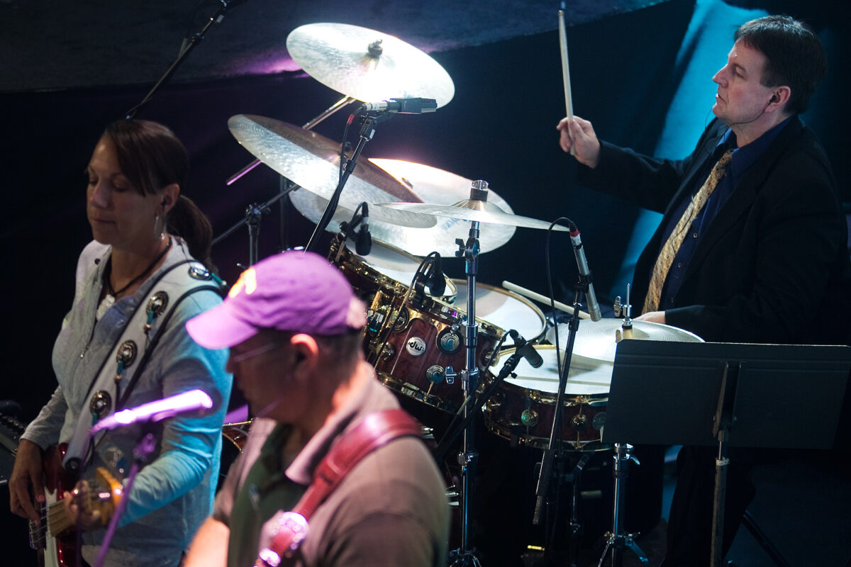 With just a five-piece kit, a number of custom cymbals and one bass drum pedal it seems the possibilities are endless for Lawrence as he expertly plays behind the other members of the band. But the drum set is just one of many percussion instruments he plays regularly. Mridangams, taxi horns, washboards, tabla — the list goes on, and Lawrence has played them all, in studios and classrooms and on stage.