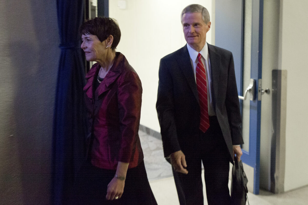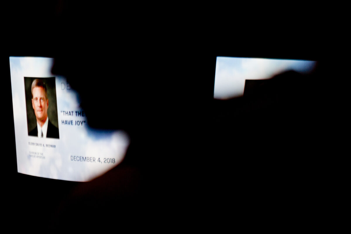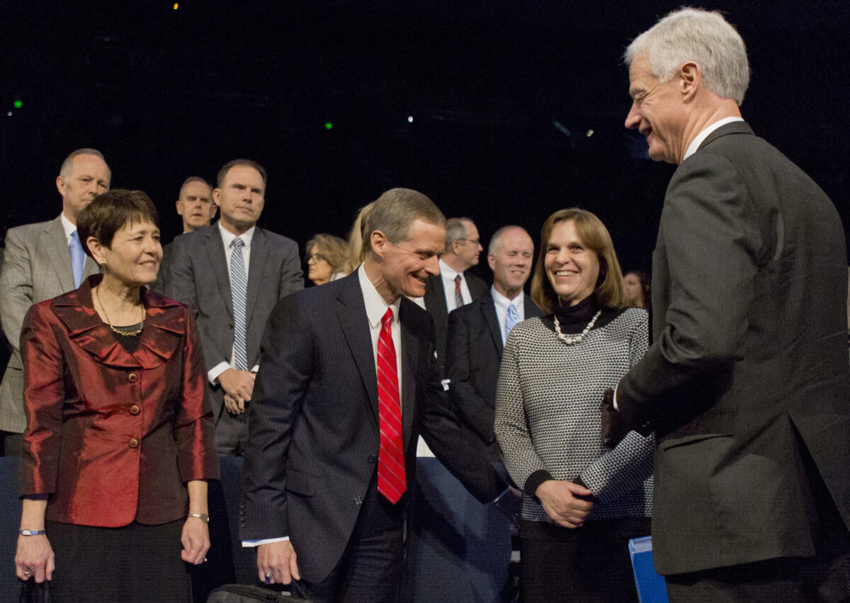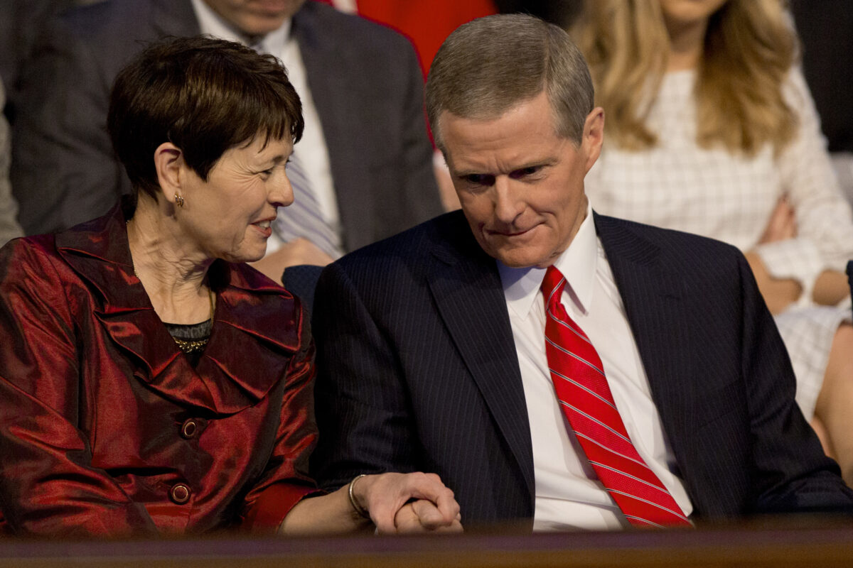Susan Bednar and David A. Bednar, a member of the Quorum of the Twelve Apostles in The Church of Jesus Christ of Latter-day Saints, speak with one another before David Bednar gives a devotional at the Marriott Center on Tuesday, Dec. 4, 2018, in Provo.
