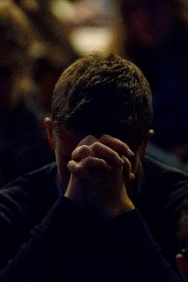 A Brigham Young University student prays during Elder David A. Bednar's devotional at the Marriott Center on Tuesday, Dec. 4, 2018, in Provo.