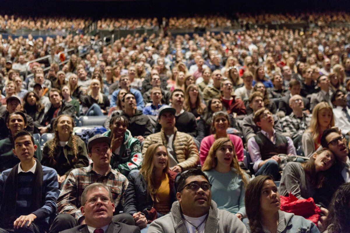 Attendees of David A. Bednar's devotional sing "Joy to the World" at the Marriott Center on Tuesday, Dec. 4, 2018, in Provo.
