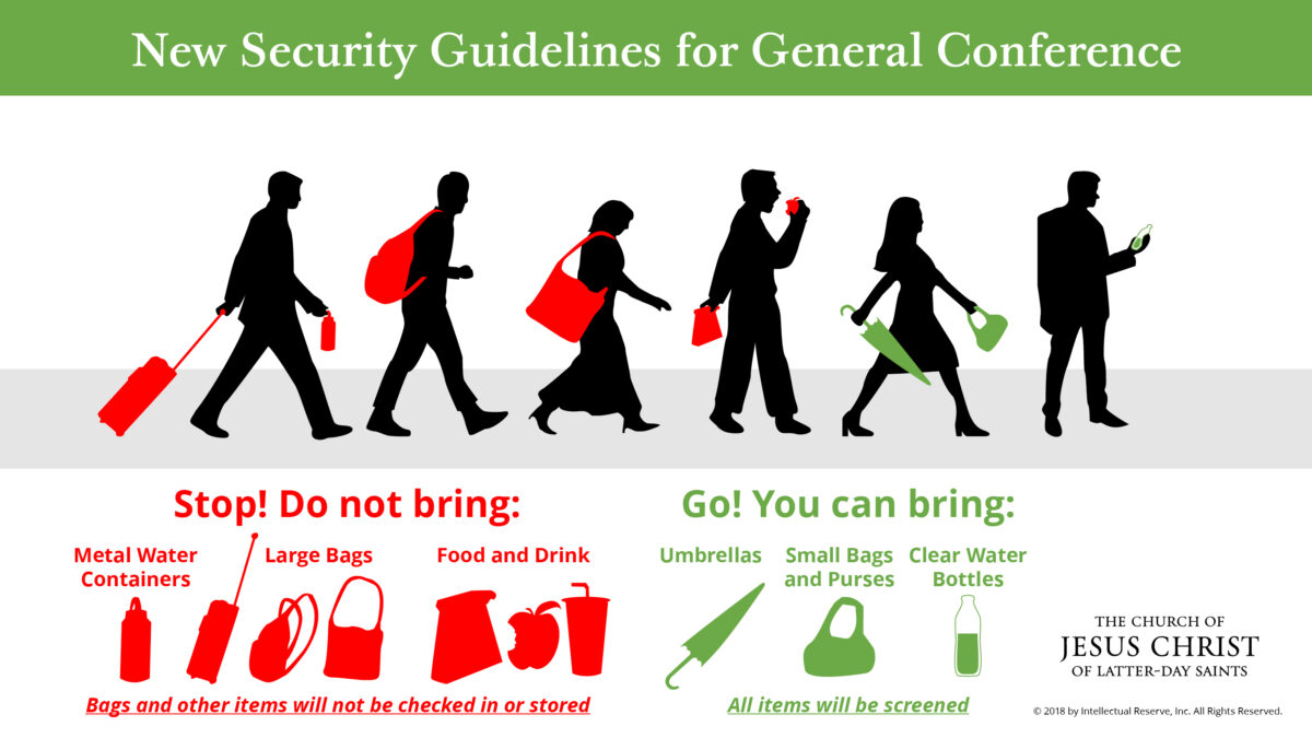 According to David Miles, director of event services at church headquarters, those attending general conference sessions next weekend cannot bring in suitcases, shopping bags, large bags and backpacks. Security personnel will not store these items for patrons. Any weapon of any kind, even with a concealed carry permit, is also not allowed.