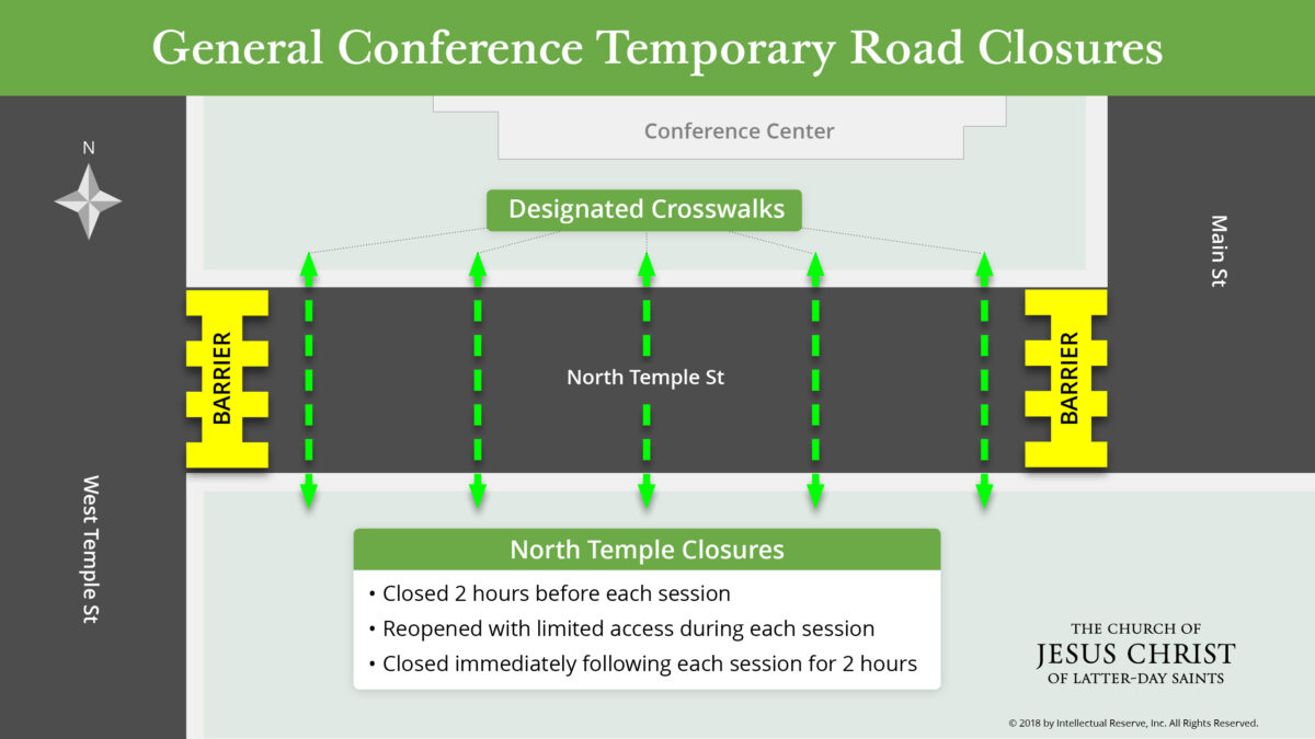 North Temple will also be temporarily closed between West Temple and Main Street two hours prior to and immediately after each session, allowing pedestrians to cross the street in crosswalks and other designated locations within the closed area. North Temple will reopen each day about two hours after general conference sessions end.