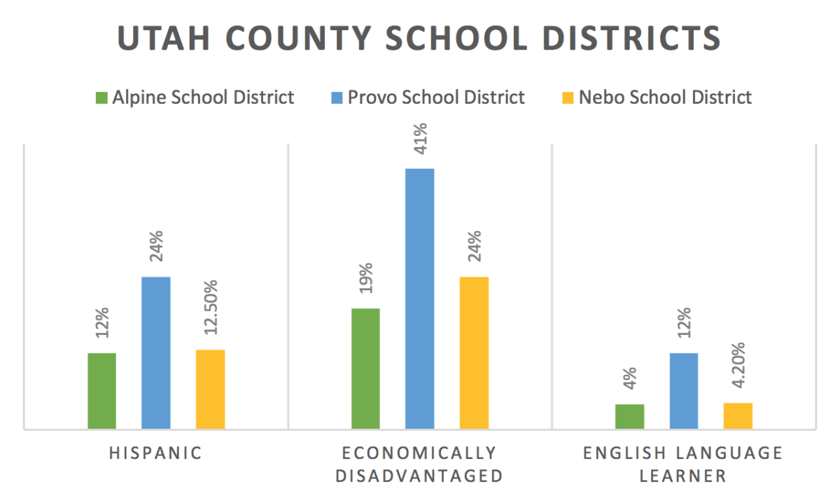 Latino populations are not spread evenly across the state, or even Utah County. According to the Utah State Board of Education, 24% of students in Provo City School District are Latino while both Nebo School District and Alpine School District round out to about 12% Latino students.