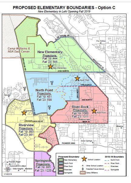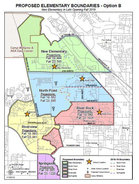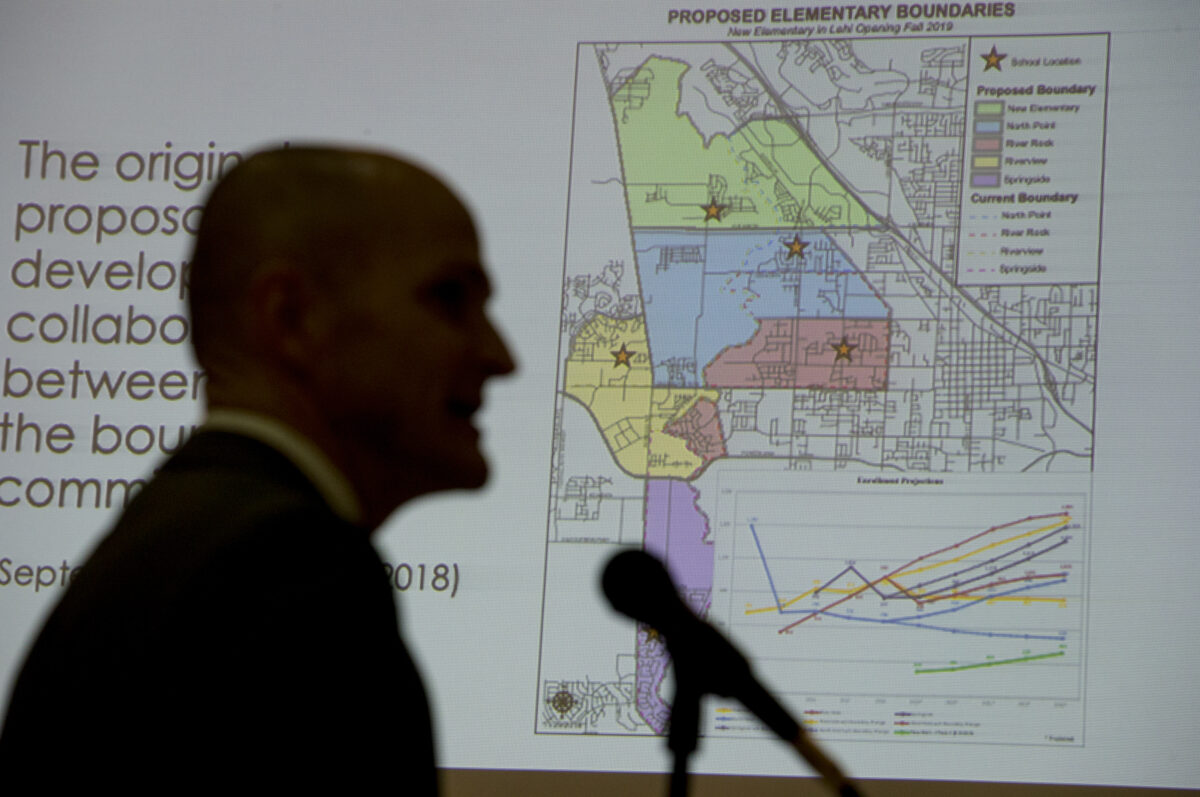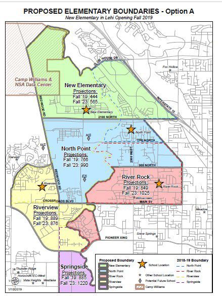 The original proposal for the school would have impacted Springside Elementary School and Riverview Elementary School in Saratoga Springs, along with River Rock Elementary School and North Point Elementary School in Lehi. Another proposal that has since been eliminated from consideration would have impacted the boundaries of Snow Springs Elementary School in Lehi, where the board’s meeting was held Tuesday evening.