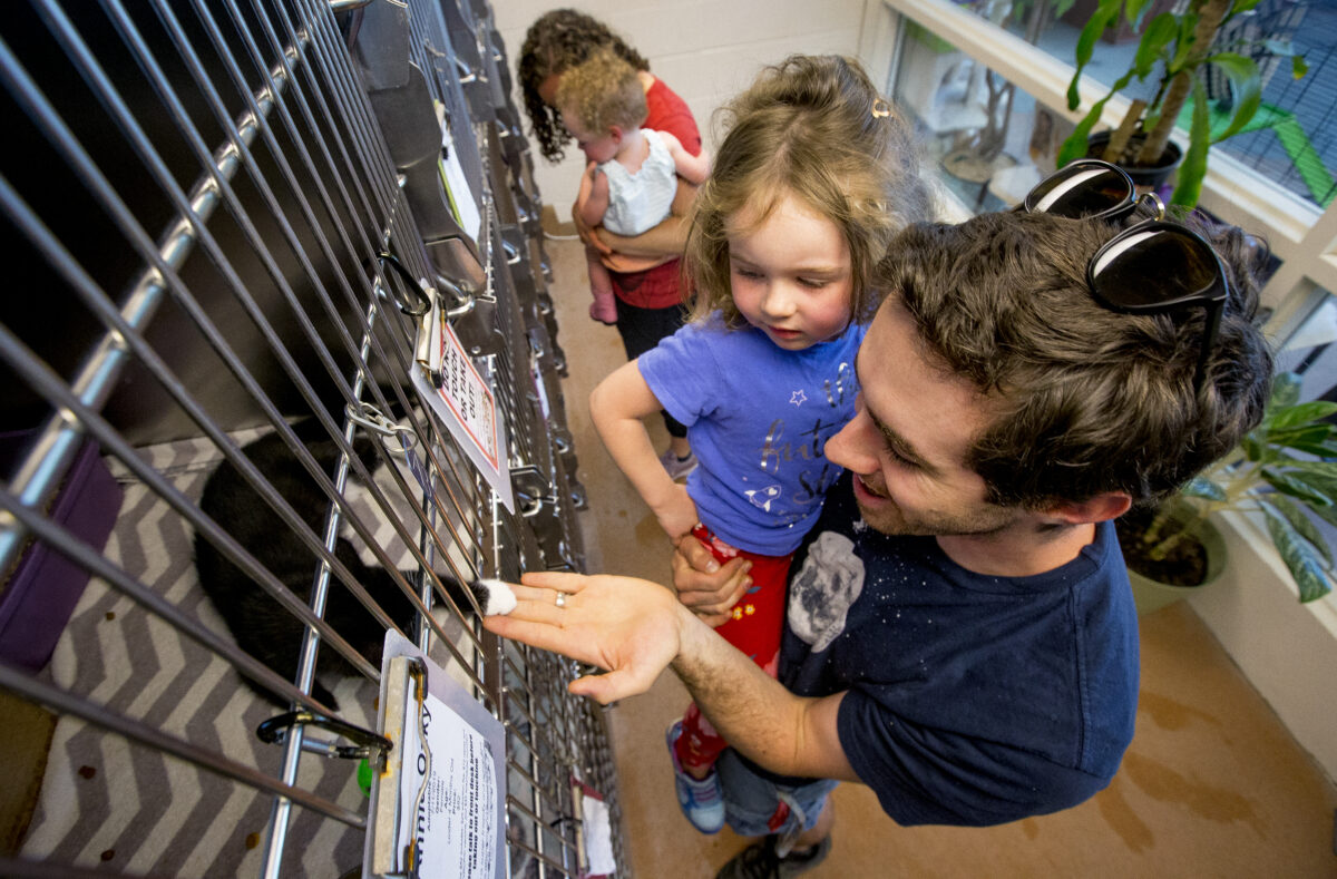 A cat greets Kimball Hill as he holds his daughter Adah, 4, and his wife Charlotte holds their daughter Lydia, 1, all of Orem, while they check out cats available for adoption Friday, July 12, 2019, at the North Utah Valley Animal Shelter in Lindon. Isaac Hale, Daily Herald