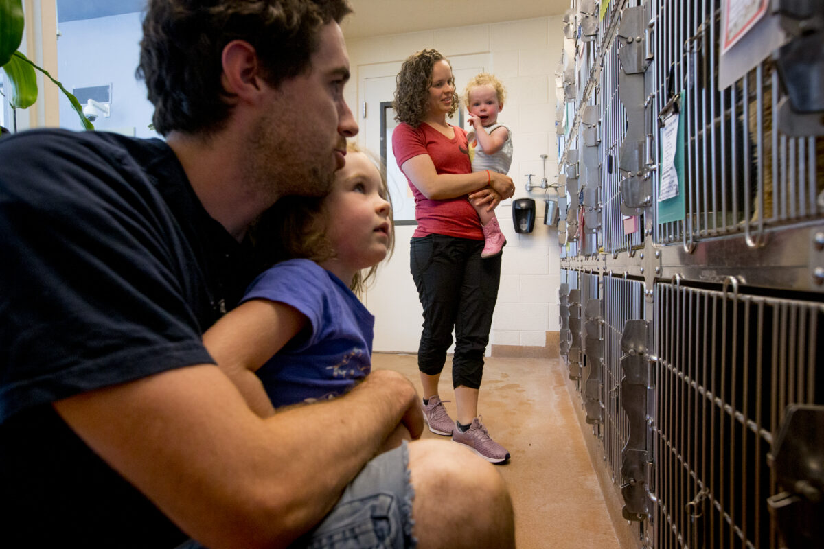 Charlotte Hill holds her daughter Lydia, 1, as her husband, Kimball, holds their daughter Adah, 4, all of Orem, while they check out cats available for adoption Friday, July 12, 2019, at the North Utah Valley Animal Shelter in Lindon. Isaac Hale, Daily Herald
