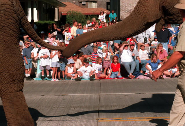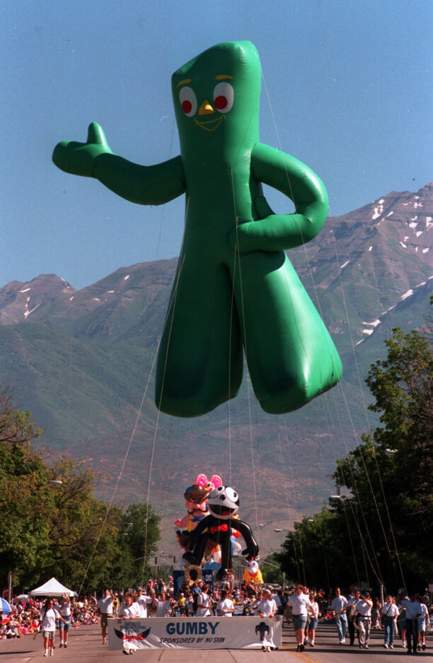 A towering hellium-filled Gumby waves to the crowd during the Freedom Festival Grand Parade in Provo, Utah Friday, July 4, 1997. Over 150,000 people came out to watch the annual event that begins a day of celebration ending in a firework extravaganza. (The Dialy Herald/Jason Olson)