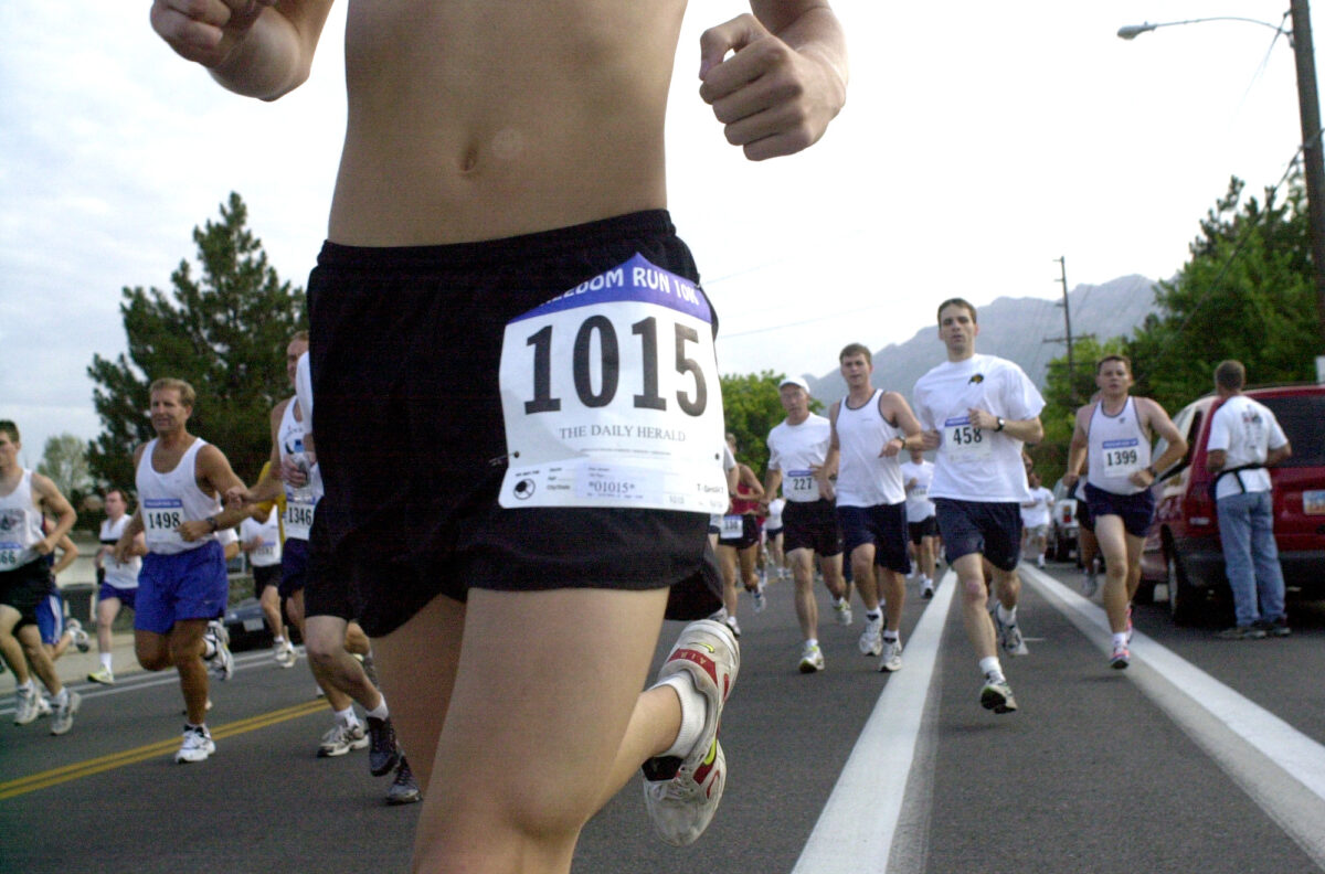 Runners participating in the Freedom Run 10K head down Timpview Drive at 7:15 a.m. to kick off the day's festivities. photo by Dan Lund 07/04/01