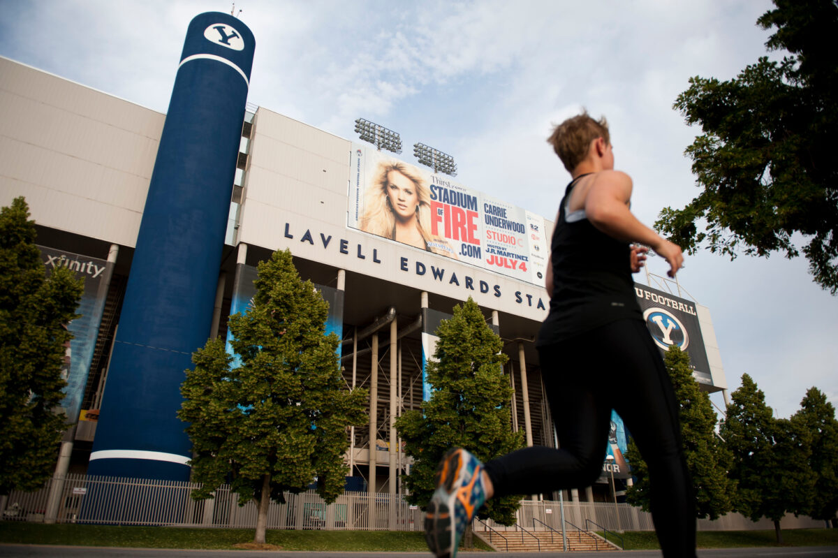 A runner runs past a sign advertising Provo's upcoming Freedom Festival and Stadium of Fire at Lavell Edwards Stadium on Wednesday, June 25, 2014. GRANT HINDSLEY, Daily Herald