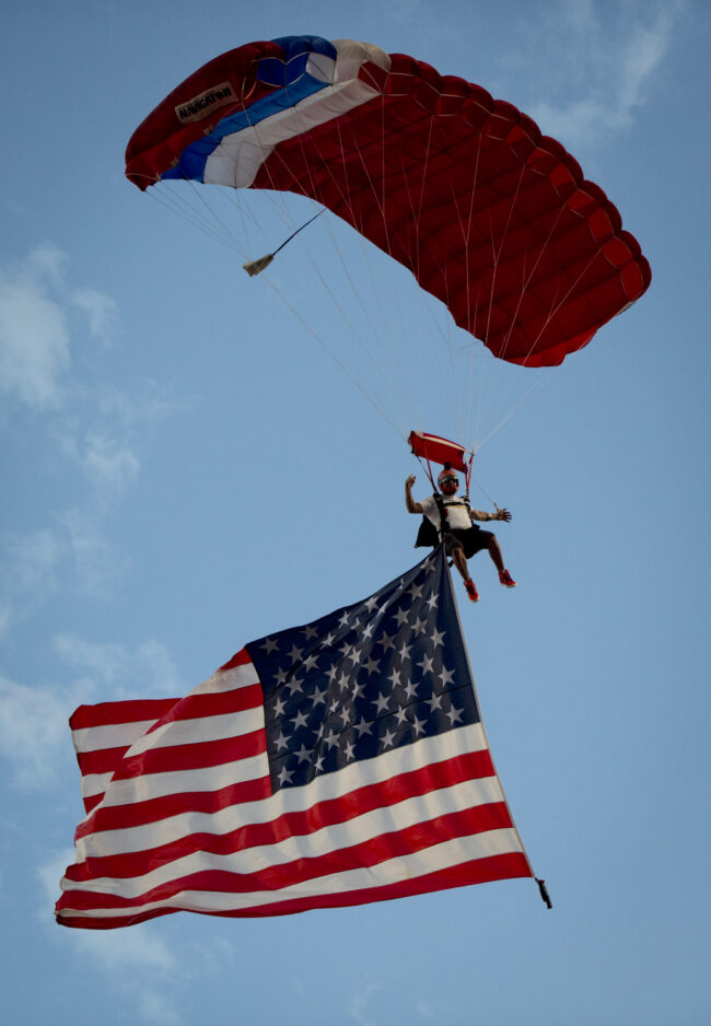 A skydiver soars into LaVell Edwards Stadium during Stadium of Fire held Thursday, July 4, 2019, in Provo. Isaac Hale, Daily Herald