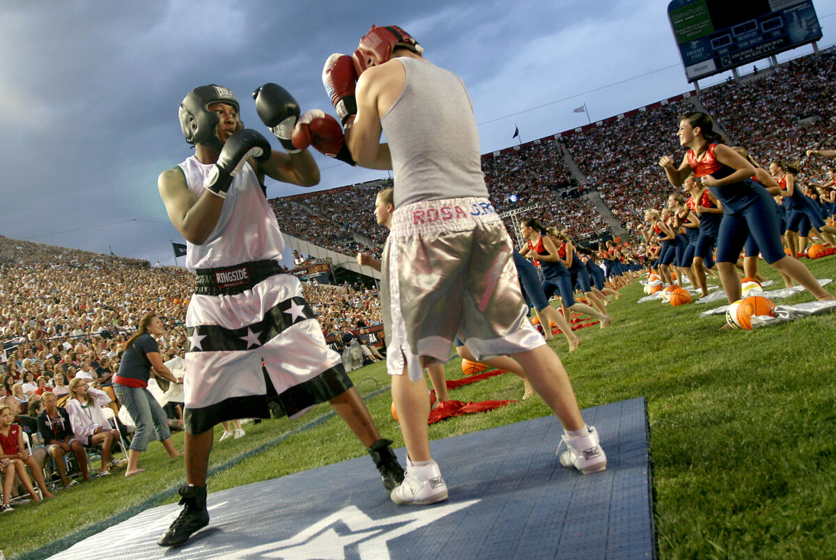 CELIA TOBIN/Daily Herald Athletes demonstrate boxing as dancers perform an Olympic tribute number, which featured local athletes representing all the summer olympic sports, during the pre-show at the Stadium of Fire in Lavell Edwards Stadium Friday, July 4, 2008 in Provo. The evening's entertainment included performances by pop star Miley Cyrus, the Blue Man Group and fireworks. Radio and television political commentator Glenn Beck hosted the event.