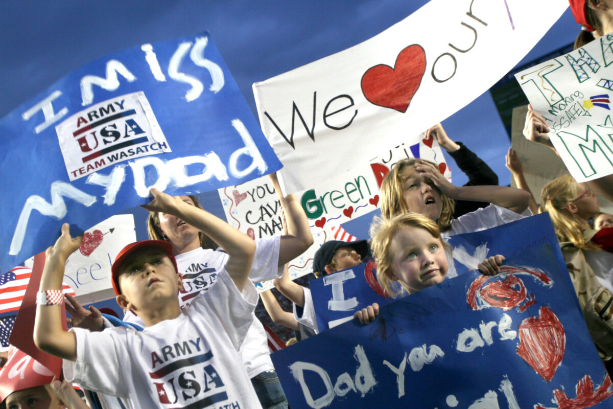 CELIA TOBIN/Daily Herald Siblings Tommy Price (from left), 7, Dasha Price, 5, and Melanie Price, 9, hold signs of support for their father, who is currently serving in Afghanistan, at the Stadium of Fire at Lavell Edwards Stadium Friday, July 4, 2008 in Provo. The children were among the many military families who were invited as special guests for the night's event. The evening's entertainment included performances by pop star Miley Cyrus, the Blue Man Group, an Olympic tribute dance number which featured local athletes representing all the summer olympic sports, and fireworks. Radio and television political commentator Glenn Beck hosted the event.