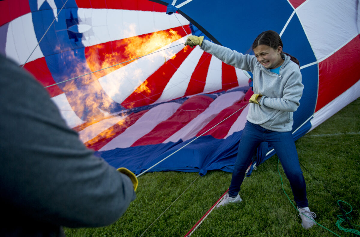 Isabelle Bramble, 11, of Vineyard, grimaces as she holds the balloon of Dee III open while hot air is pumped into it before preliminary flights as part of the Freedom Festival's Balloon Fest on Wednesday, July 3, 2019, at Fox Field in Provo. Isaac Hale, Daily Herald