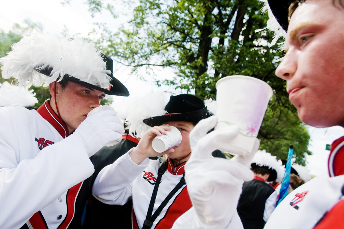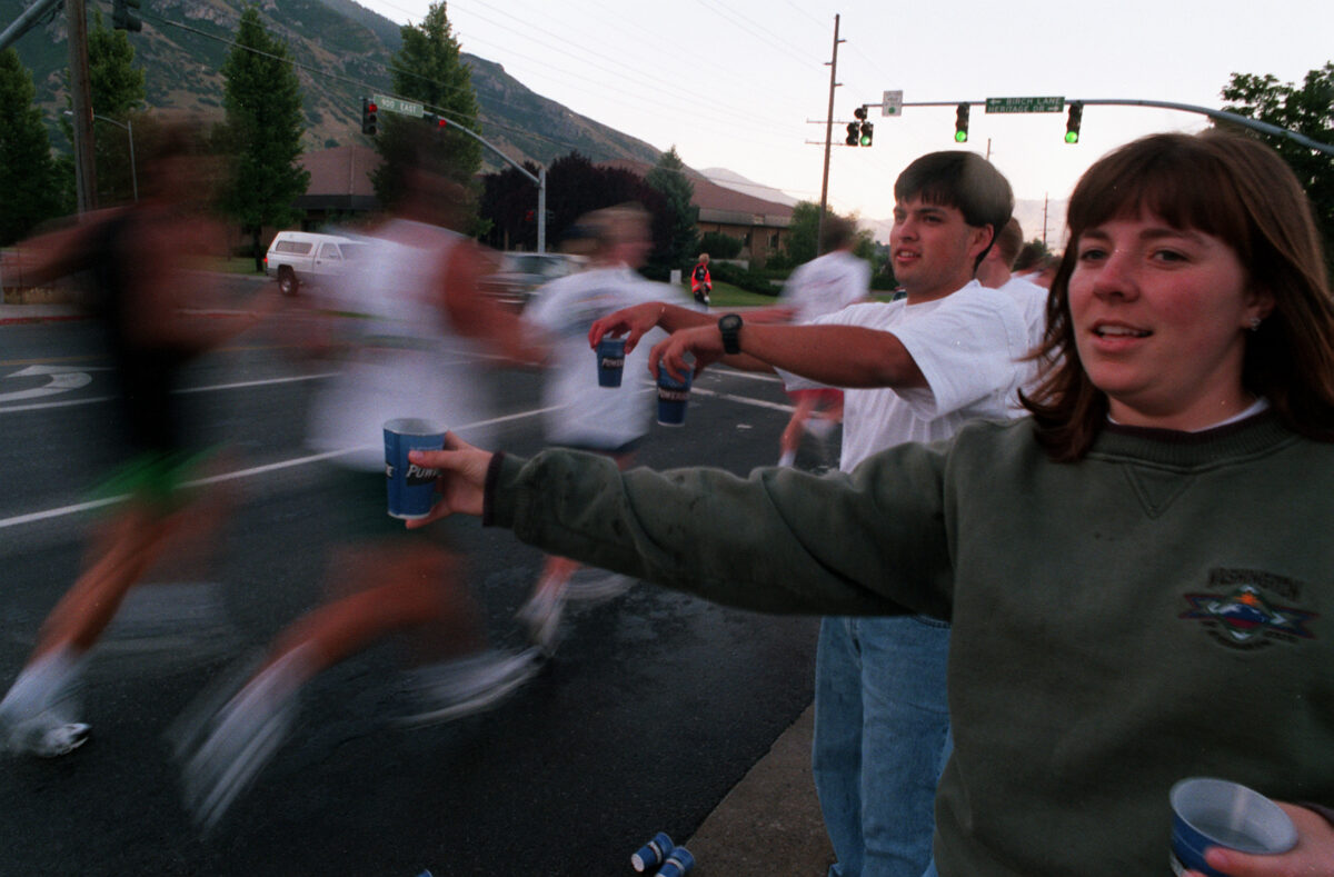 Angela Roneril, right, and Brett Hunt hand out water to runners as they pass by during the Freedom Festival 10K Friday, July 4, 1997. Photo by Jason Olson 7/4/97