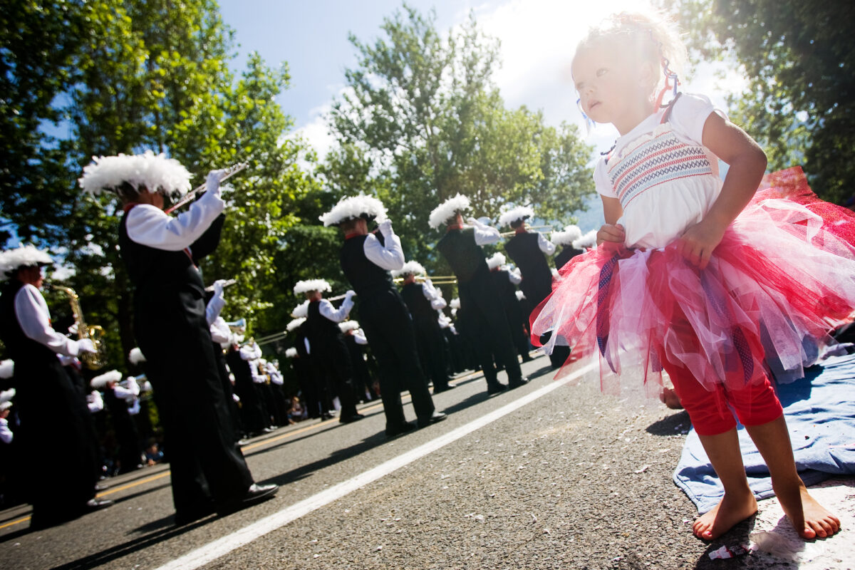 Ava Stephens, 3, visiting from Colorado, watches as the American Fork High School Marching Band passes during the Freedom Festival Grand Parade Saturday, July 4, 2009. MARK JOHNSTON/Daily Herald