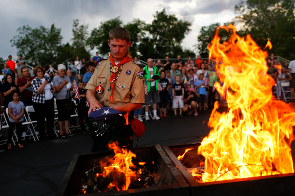 Taggart Greenhalgh, a member of Provo's Troop 51, places a flag into the fire at the America's Freedom Festival flag retirement ceremony outside the Macey's grocery store in Provo on Monday, June 15, 2015. SPENSER HEAPS, Daily Herald