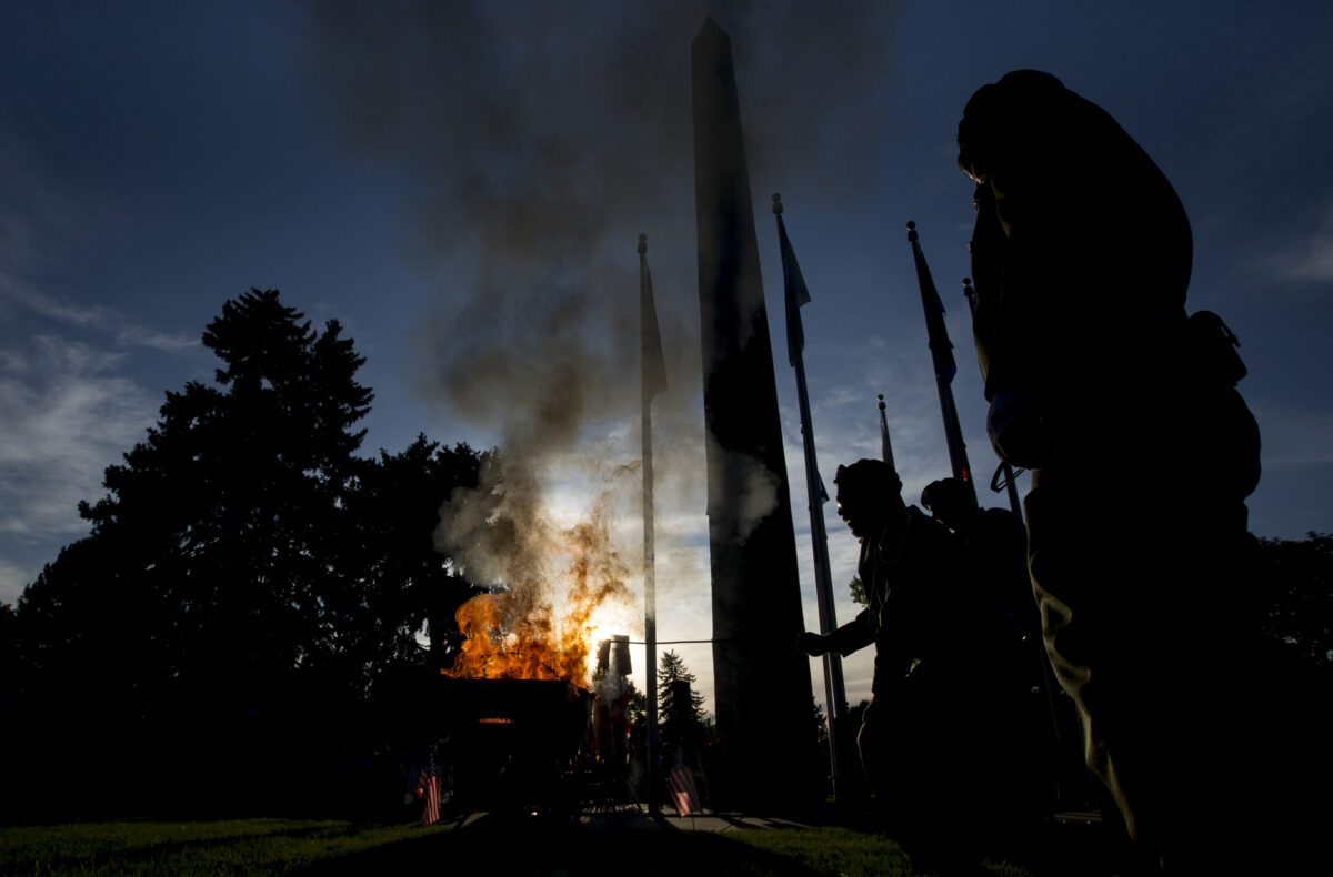 Members of the Provo Fire and Police Departments along with the Utah County Sheriff's Office keep American flags within the flames as they're retired during the Freedom Festival's flag retirement ceremony held Friday, June 14, 2019, at Memorial Park in Provo. Isaac Hale, Daily Herald