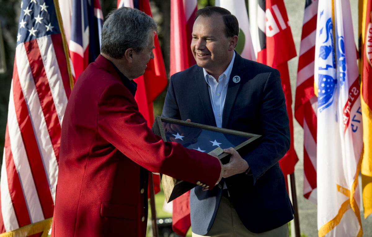 Utah Sen. Mike Lee presents an American flag to Paul Warner, exiting executive director of the Freedom Festival, during the Freedom Festival's flag retirement ceremony held Friday, June 14, 2019, at Memorial Park in Provo. Isaac Hale, Daily Herald