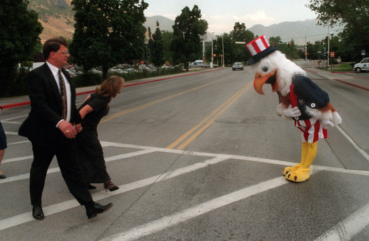 Eddie the Eagle greets guests as the enter the Wilkinson Center Friday, July 2, 1999 for the Freedom Festival Awards Gala. Photo by Jason Olson. 7/2/99