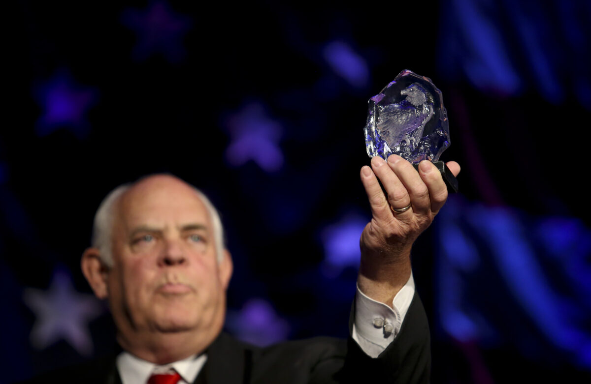 Jim Evans, president of America's Freedom Festival, holds up the Freedom Award during the Freedom Awards Gala held Saturday, June 30, 2018, at the Utah Valley Convention Center in Provo. Isaac Hale, Daily Herald