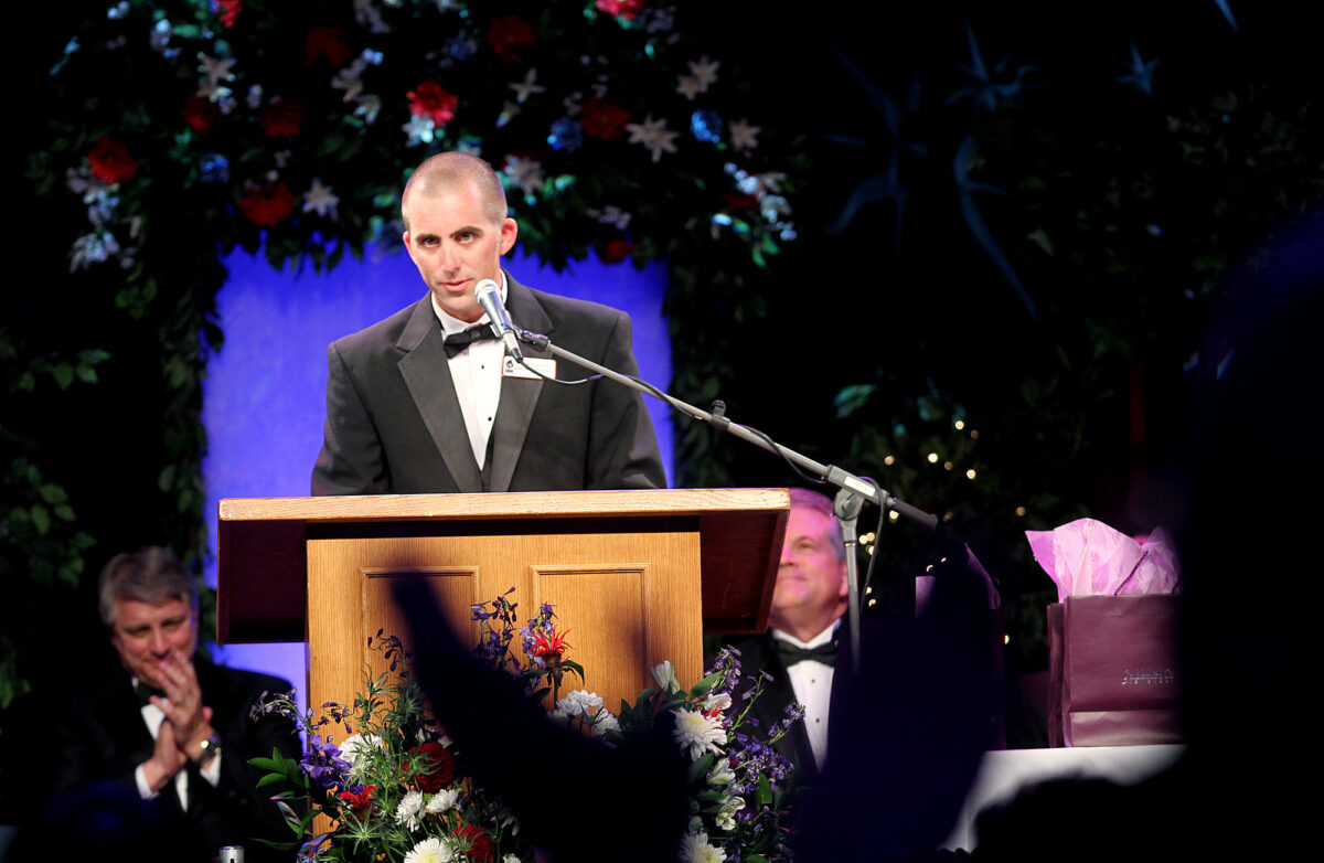 Jeff Olsen, a driver for Waste Management in Chicago who collects improperly disposed American flags to retire them properly, speaks to an audience while being recognized at the Freedom Awards Gala hosted by the American Freedom Festival, at BYU in Provo Friday, July 2, 2010. MARK JOHNSTON/Daily Herald