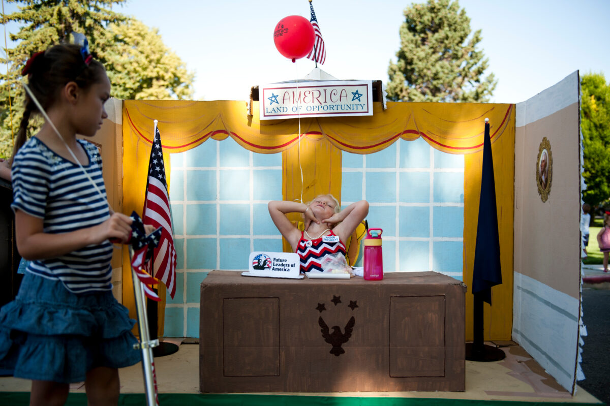 Maddie Arnold, 5, stretches in her cardboard oval office on a float before America's Freedom Festival Children's Parade in Provo on Saturday, June 27, 2015. GRANT HINDSLEY, Daily Herald