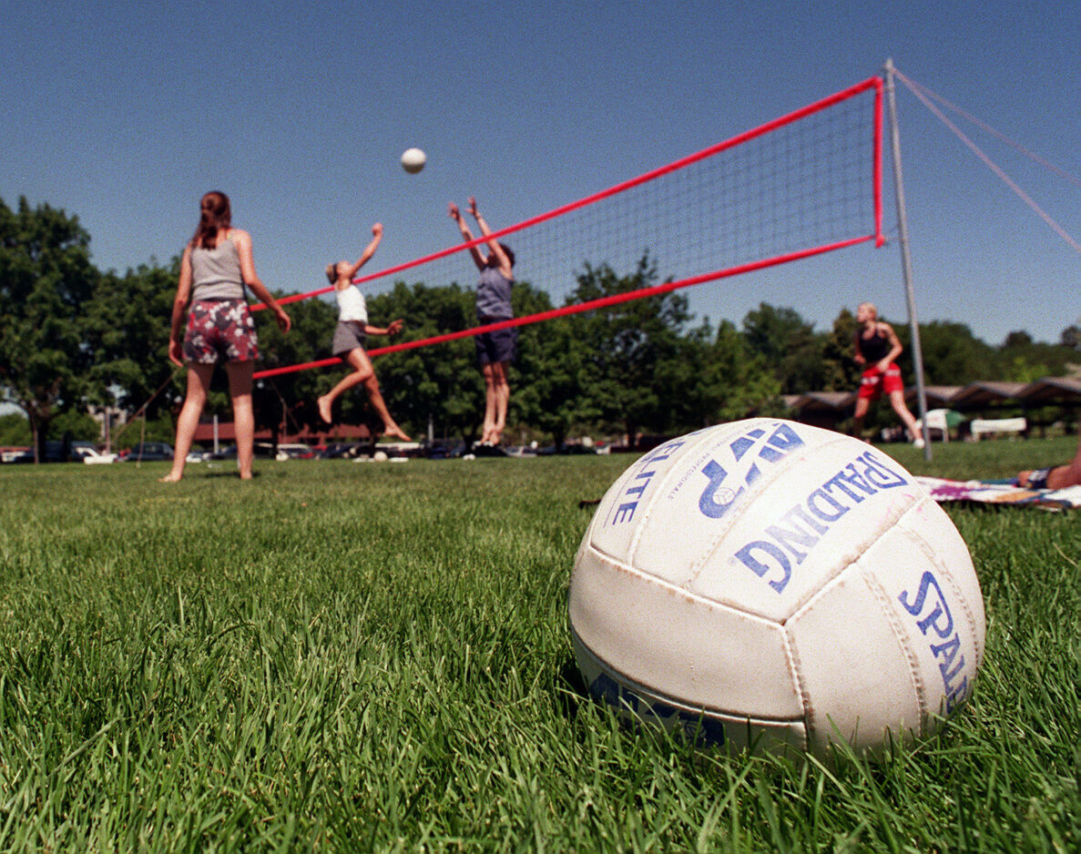 Participants in the Freedom Festival volleyball tournament meet at the net during a match Friday, July 2, 1999 at Scera Park. Photo by Jason Olson. 7/2/99