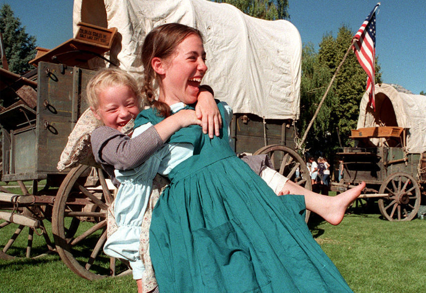 Kassi Hulet, in green, and Laurel Krauel share a laugh at the Heritage Park Living Exhibit, part of the 1998 America's Freedom Festival. The girls dressed up in period costumes representing the Mormon settlers wagon trail. Friday 07/03/98 Photo/Kevin Lee