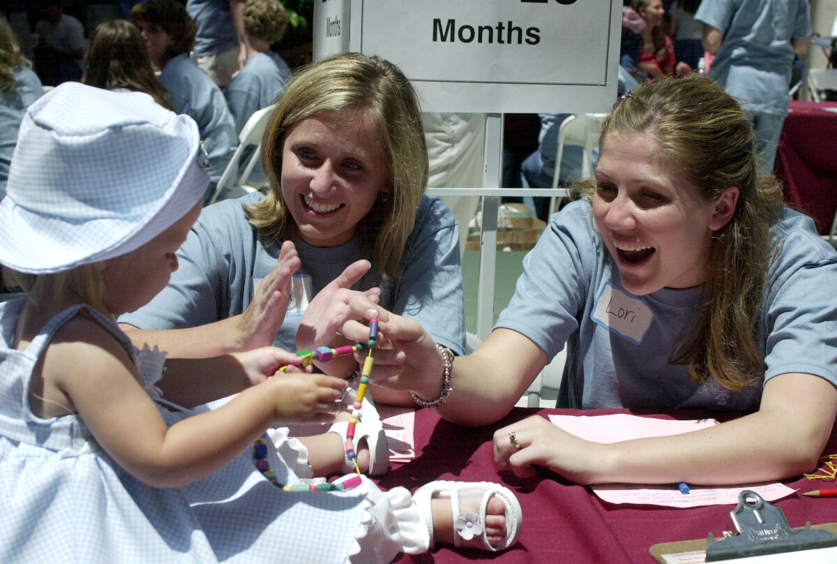 America's Freedom Festival Baby Contest 2001 judges Trisha Swensen, left, and Lori Rasband try to get contestant Kaitlin Boyd to show her charm at the Provo Towne Centre Mall. 06/23/01 Photo/Kevin Lee
