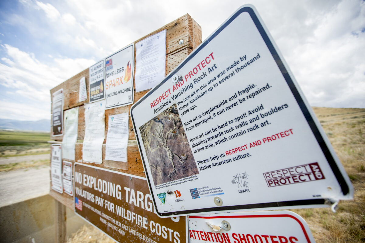 Multiple signs posted by the Bureau of Land Management urge shooters to “respect and protect America’s vanishing rock art,” but most of the signs themselves are decorated with bullet holes.
