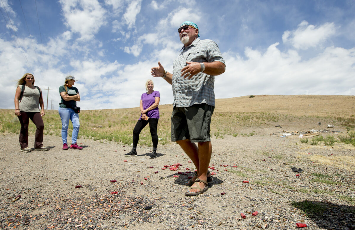On the tour, Acerson points to a boulder on the mountain just a few hundred feet beyond a shooting site riddled with shotgun shells and bullet casings, some of which are fresh and others that are corroded nearly beyond recognition. The boulder has petroglyphs drawn on it, Acerson tells the group, pausing as shots ring out in the distance.