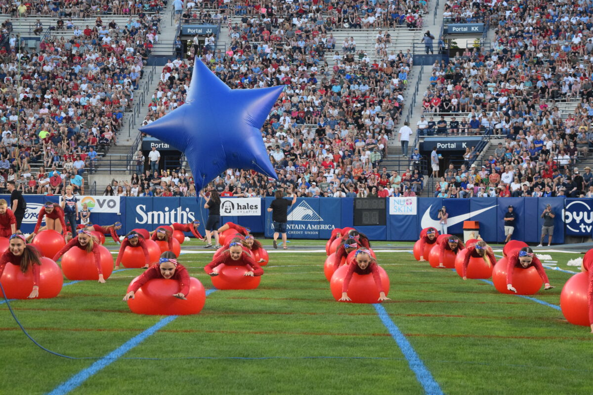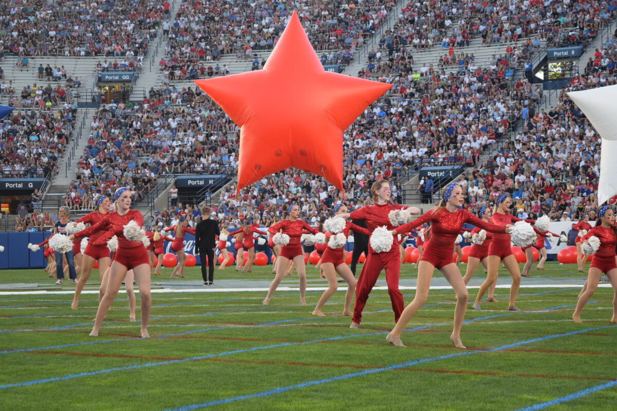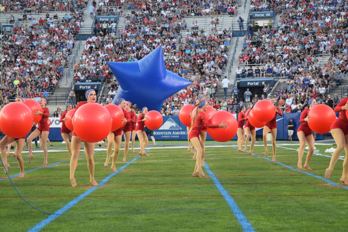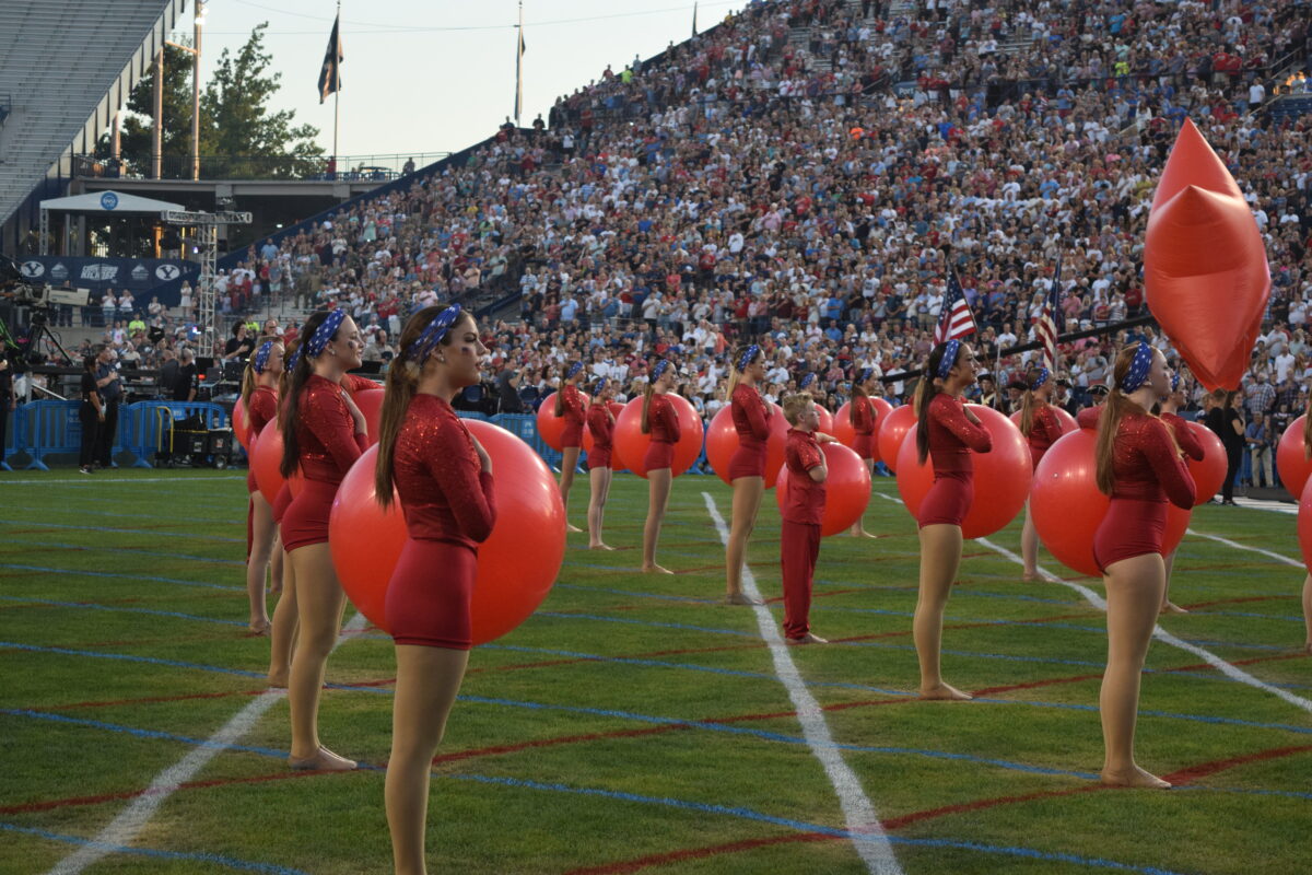 Next, the Stadium of Fire Dancers lined up across the field in ruby leotards and performed a routine utilizing red exercise balls.