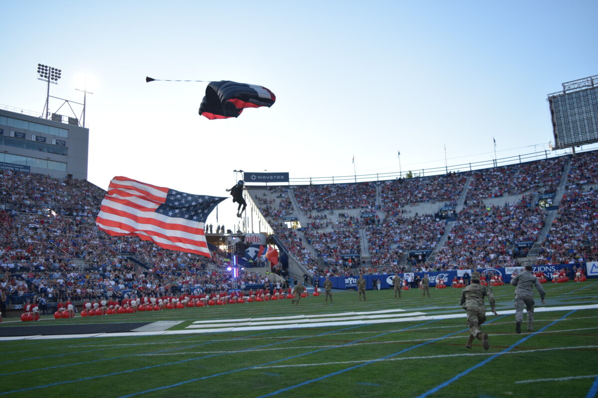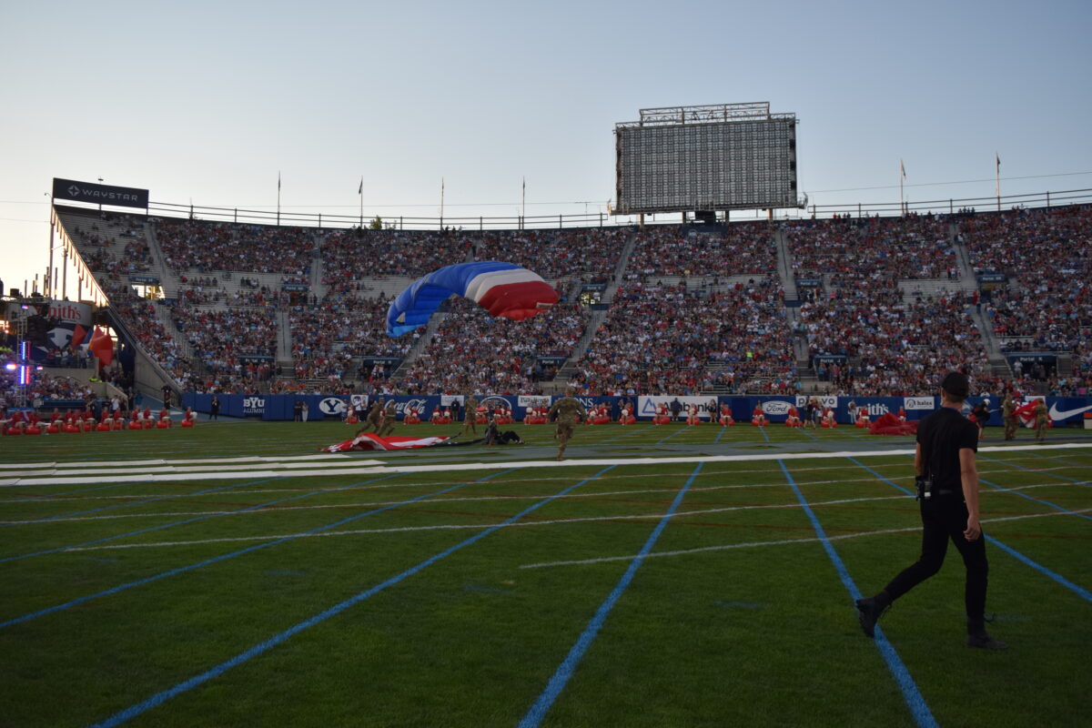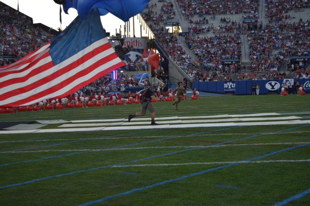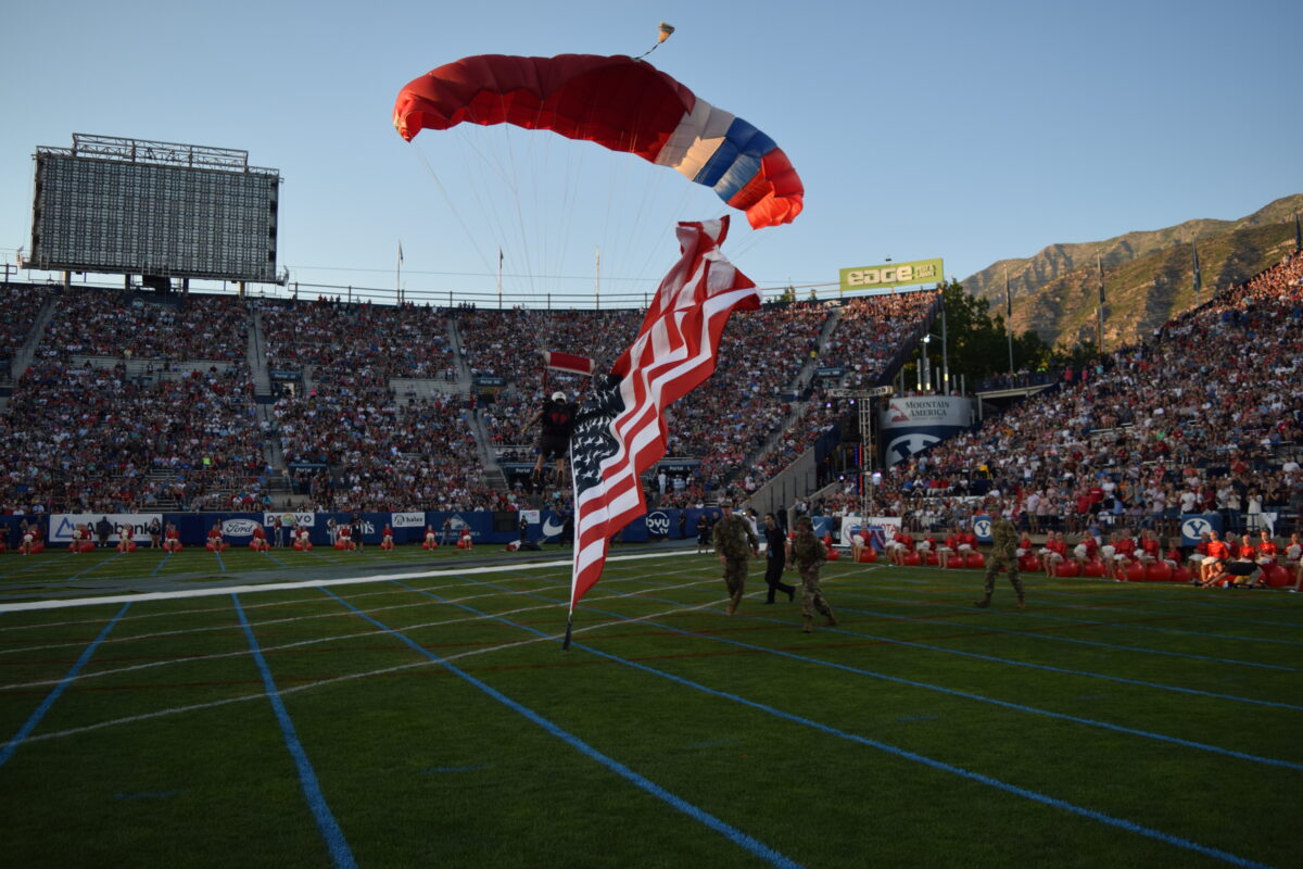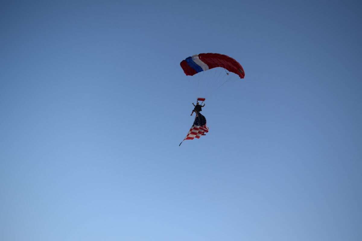 A half-dozen skydivers dropped from the sky and circled around the stadium as American flags attached them flapped in the wind. After a few minutes of circling the field, they dropped down and came to a running or tumbling halt near the 20-yard line.