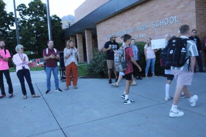 - Sixth grade teachers from feeder elementary schools welcome seventh graders to Oak Canyon Jr. High in Lindon on Aug. 14, 2024.