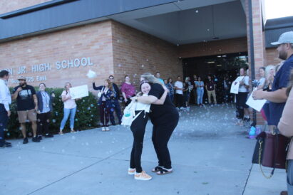 On Wednesday morning, students were welcomed to their new junior high by sixth-grade teachers from feeder elementary schools who cheered the students on while energetic music boosted the excitement.