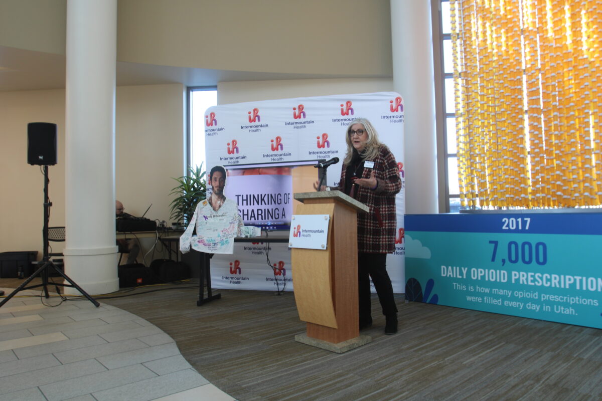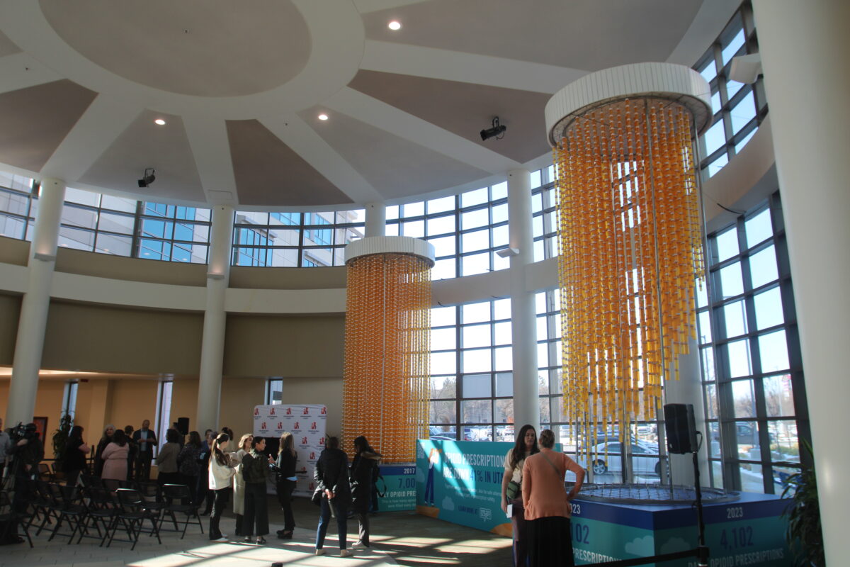 During Tuesday’s press briefing, Intermountain Health, in conjunction with the statewide opioid prescription misuse prevention campaign Know Your Script, unveiled a 20-foot chandelier symbolizing the ongoing and continued commitment to reducing opioid prescriptions in the state.