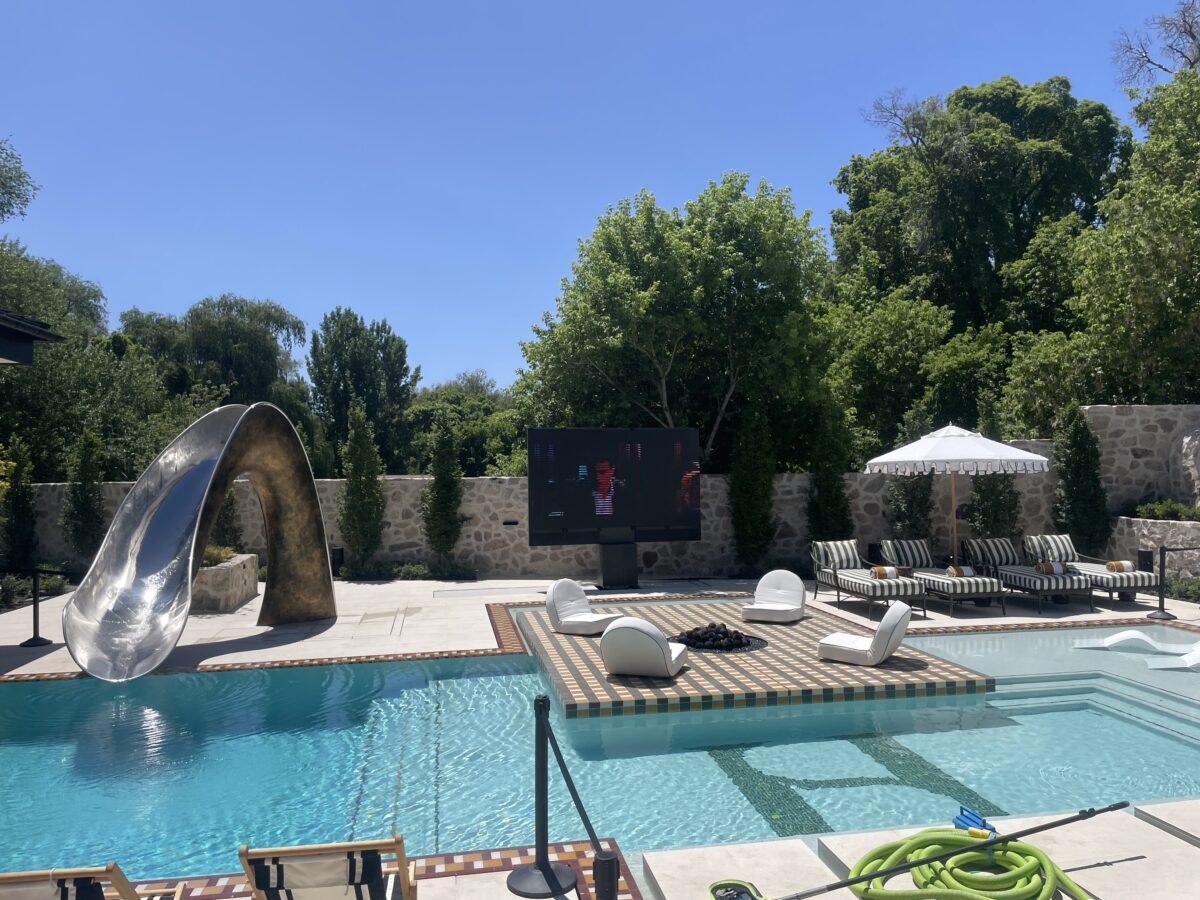 Robison Home Builders property manager Brandon Jensen believes the home’s highlight is its pool area, which has a custom stainless steel slide imported from the U.K. and a 150-inch folding outdoor TV.