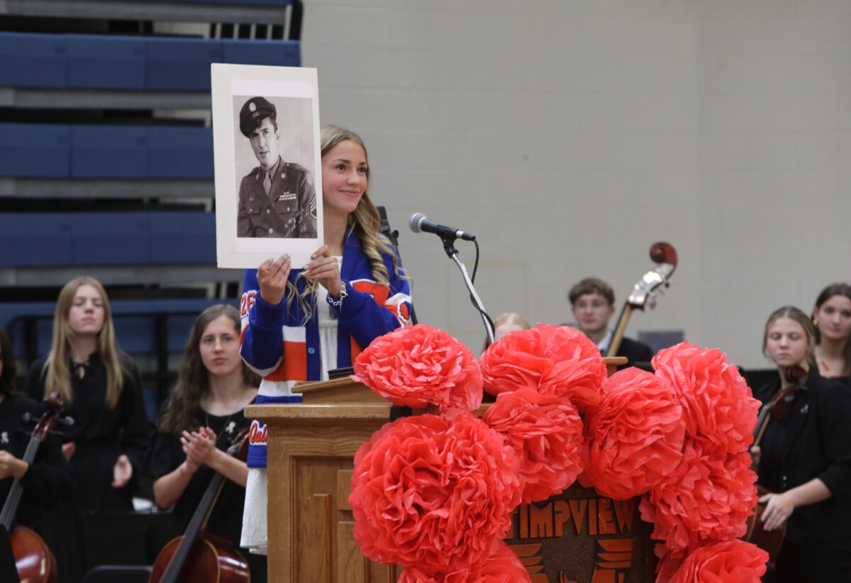 - Student Quincey Perry displays a photo of her great-grandfather, 1st Lt. Edward J. Perry, during the Veterans Tribute Tuesday, Nov. 11, 2025, at Timpview High School in Provo.