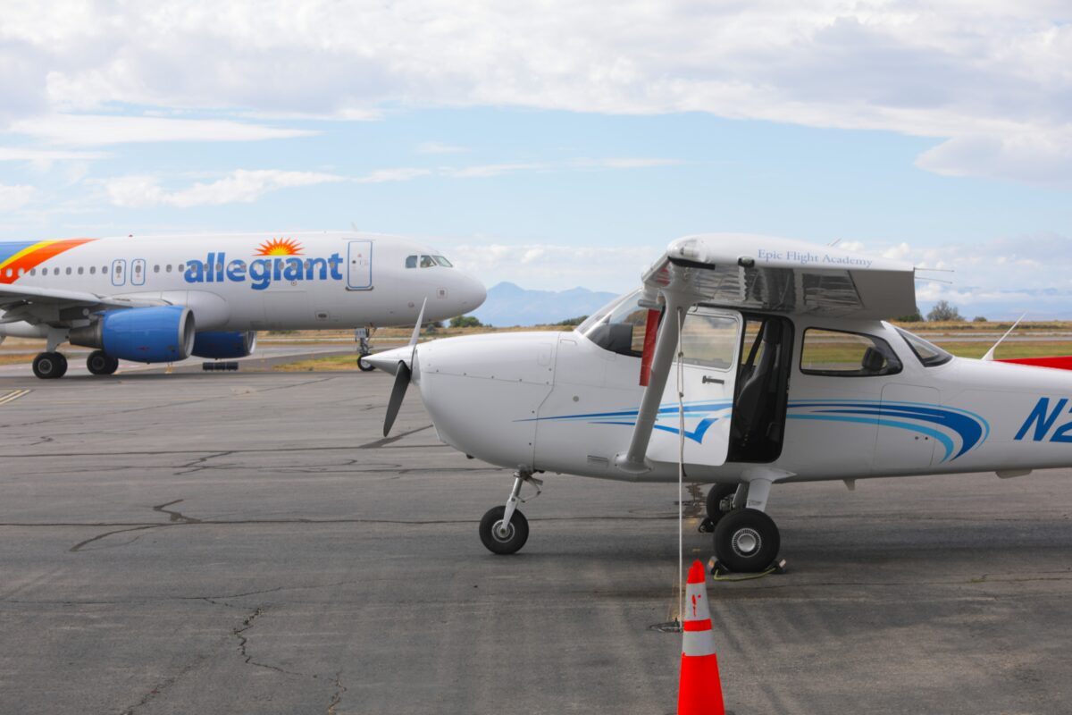 - An Epic Flight Academy aircraft is shown while an Allegiant flight prepares for take off Friday, Oct. 10, 2025, at Provo Airport.