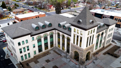 Its exterior edifice was designed to pay homage to a community hub of old, the Lehi Tabernacle, with a tall central tower fitted with a pyramid top and corner towers that match the tabernacle’s silhouette.