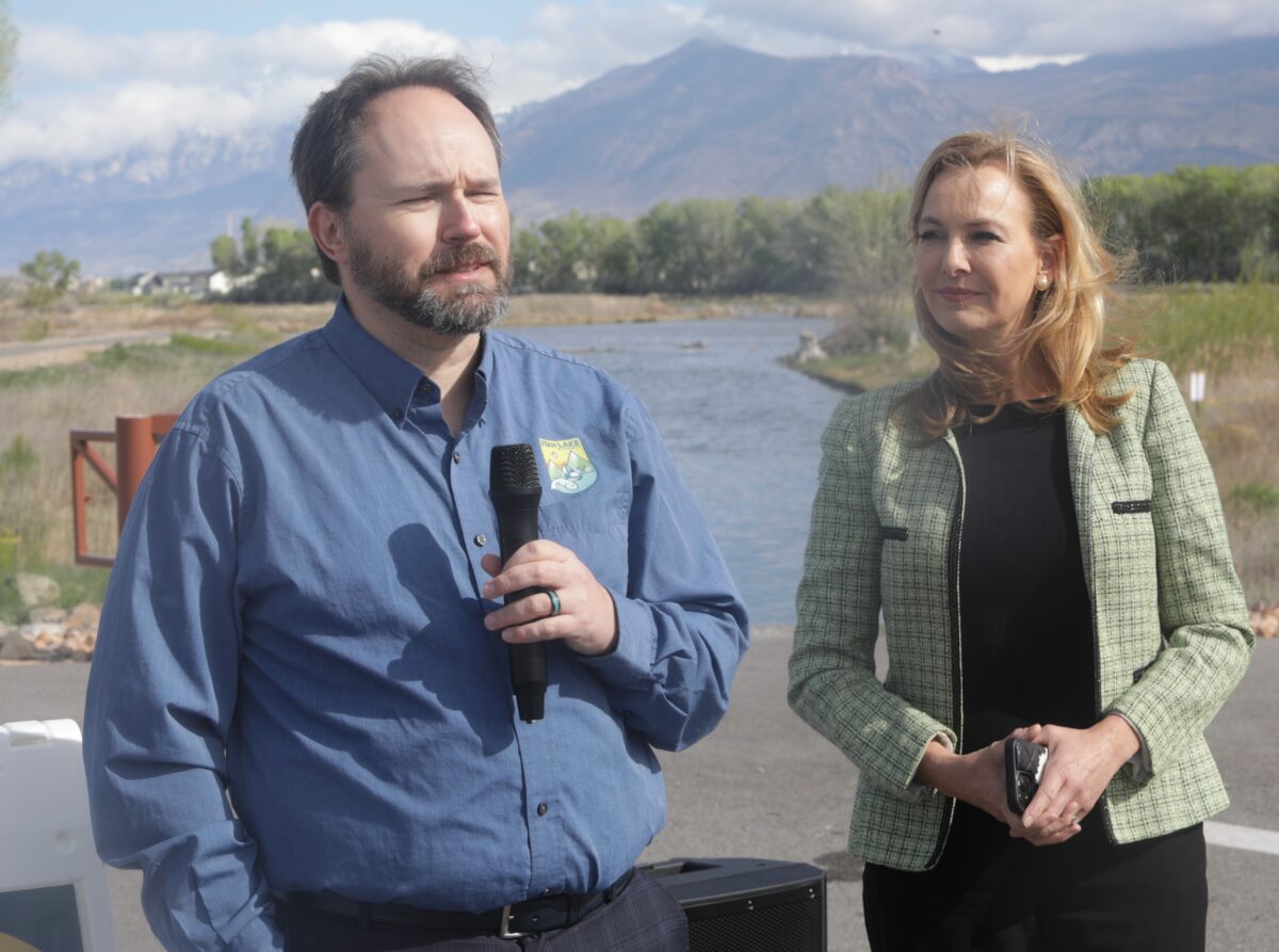 - Utah Lake Authority Director Executive Director Luke Peterson, left, and board chair Carolyn Lundberg speak about harmful algal blooms Tuesday, April 14, 2026, at the Provo River Delta.